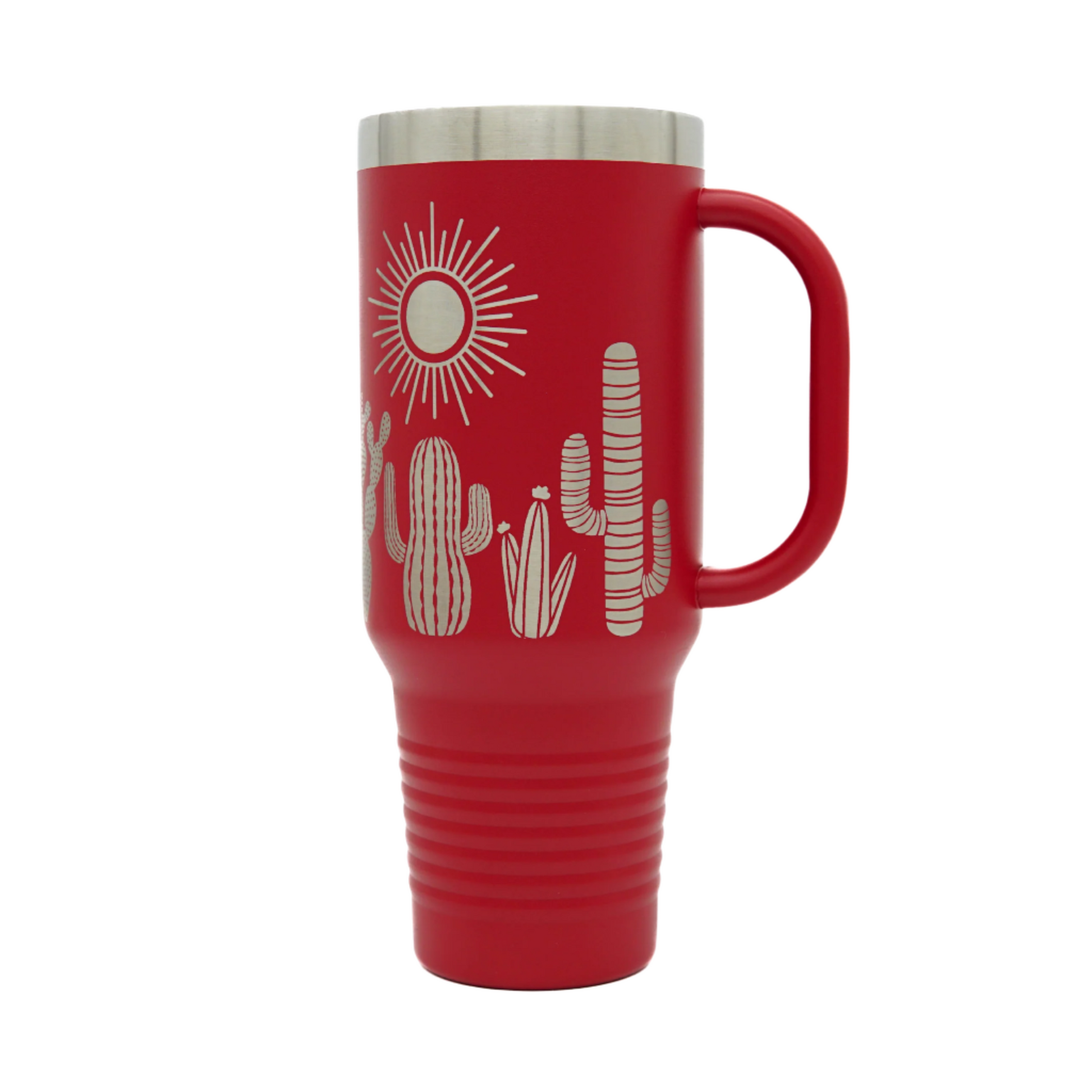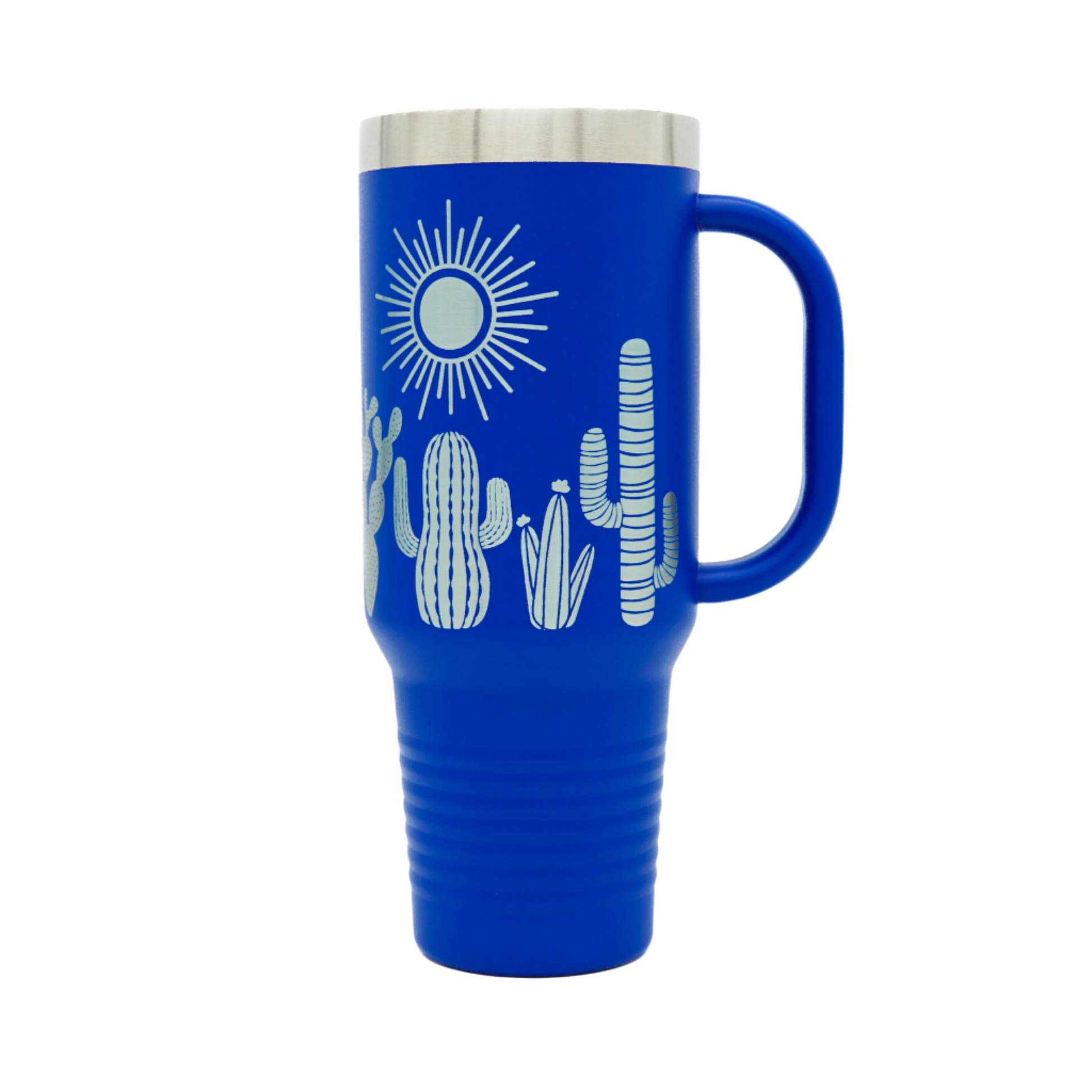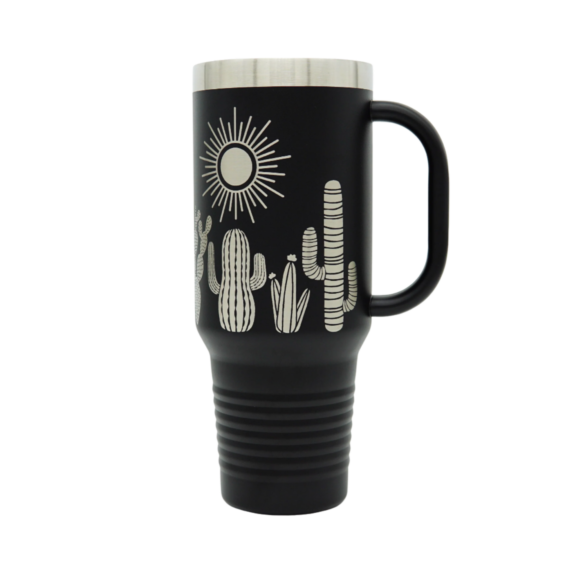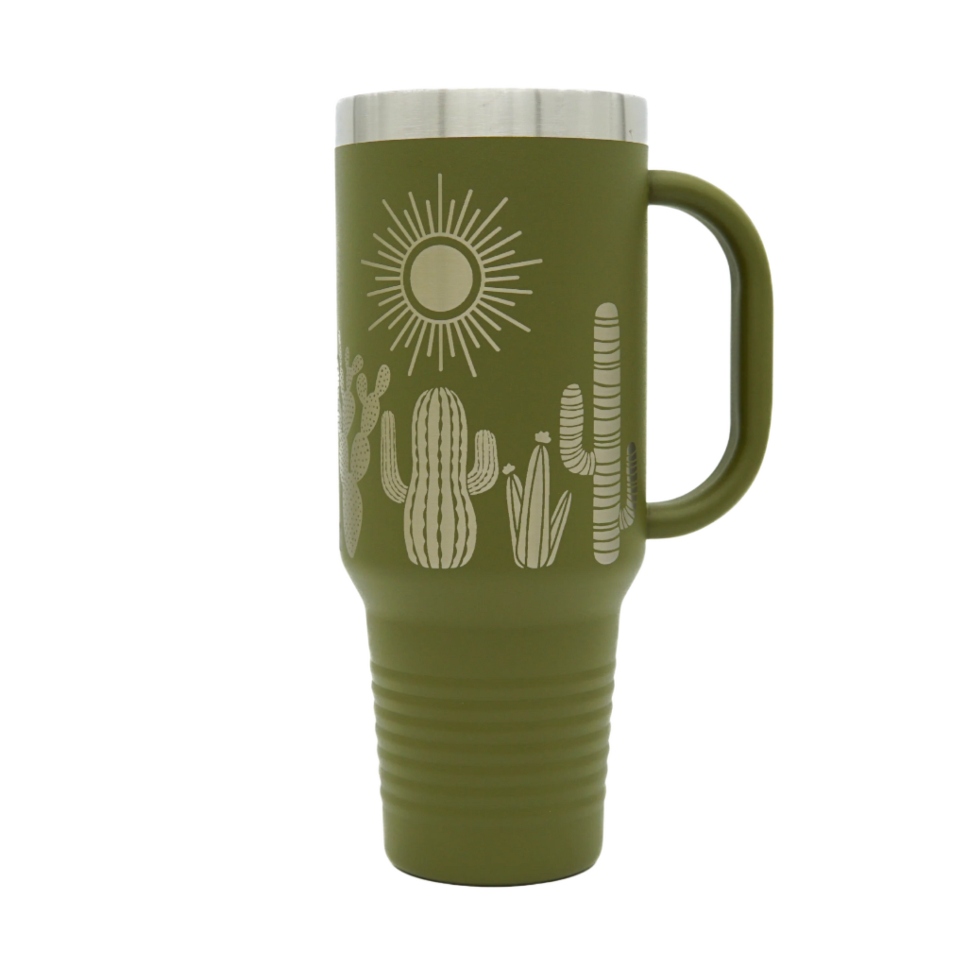 Our travel mug checks all of the boxes. Does it insulate hot and cold drinks? Definitely. Will it hold a lot of my beverage of choice? 40 ounces worth. But does it fit in a cup holder? Hell yeah! Does it have a handle for easy travel? You bet. Can it be used with or without a straw? Yep. Does it remind me of the beauty of cacti? Abso-freakin-lutely.