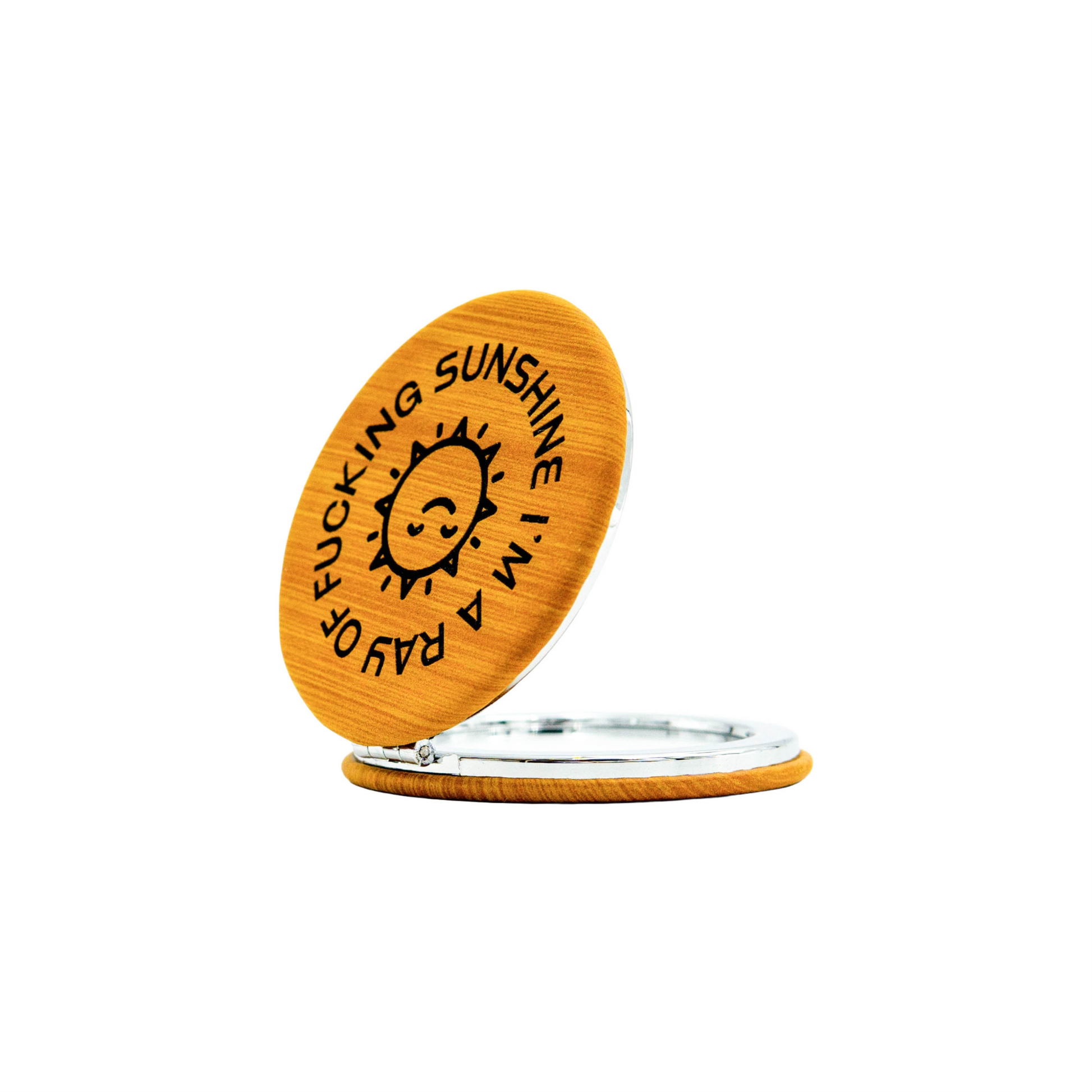 "I'm a Ray of Fucking Sunshine". Check your gorgeous, sunny self out in these adorable, fun, vegan leather pocket mirrors. They fit perfectly in your pocket, purse, and Christmas Stocking!